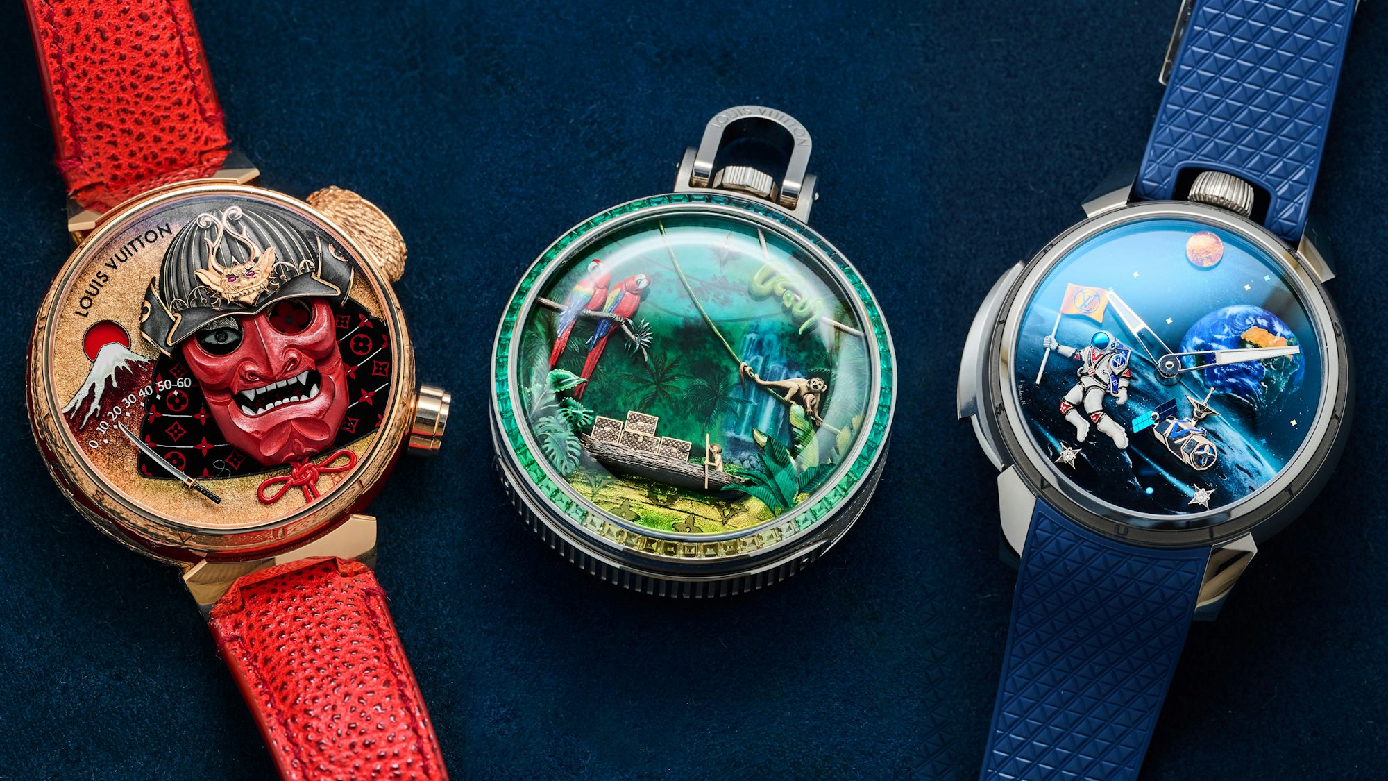 The brand used miniature enamel and paillonné enamel on the background with 31 colors. For those that don’t know, some enamel is a finite resource and is so rare that once it’s gone, it’s gone for good. The choice to use so many enamel colors adds an intensity and vibrancy to the watch that is rarely seen in modern watchmaking. Yes, the LV monogram marks in the yellow/green water might be a little on the nose here, but I can overlook them for the pure craft of it all. Just look at that log. It looks so realistic.
