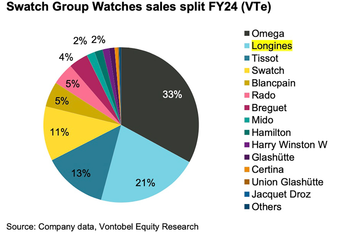 Longines sales have suffered amid the pullback in China, according to analysts at Switzerland’s Vontobel, who estimate that the brand fell from the 4th largest Swiss watch brand by sales in 2019, with approximately CHF 1.6 billion in sales, to the 7th largest in 2024, with CHF 1.2 billion in sales. Longines accounted for about 21% of Swatch Group sales in 2024, the second-biggest contributor behind Omega, according to Vontobel.