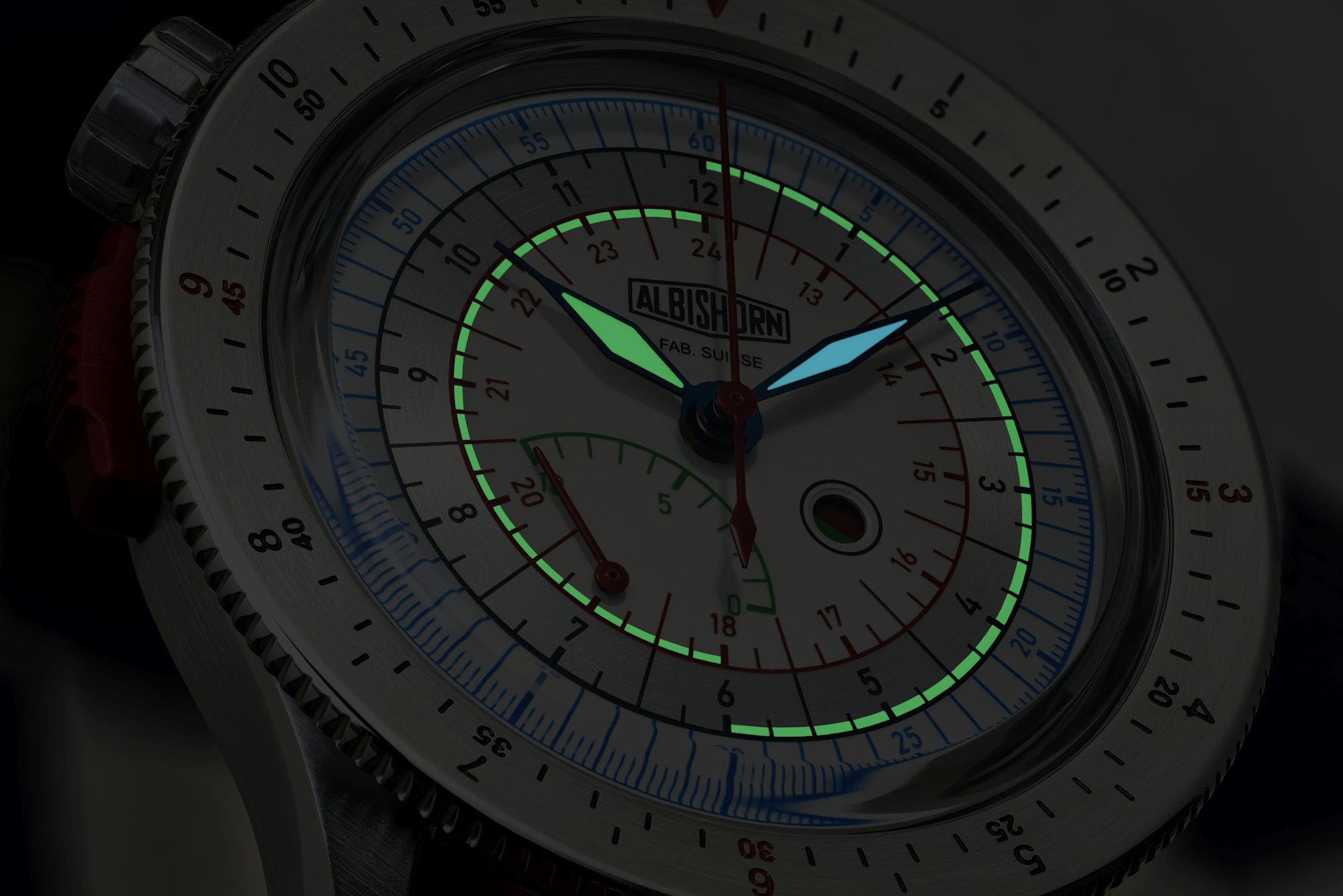 The ten-minute regatta countdown track, printed in green and accompanied by a red hand, is the biggest and most unique feature of the Maxigraph and a good indicator (no pun intended) of what Albishorn might keep bringing to the table as it develops new watches. A typical regatta chronograph will keep restarting its indication as the countdown finishes, but on the Maxigraph, the regatta timer will stop once the ten minutes have been hit, with the countdown hand resting at “0” while the main chronograph seconds hand continues to run. When the chronograph is reset, both the minutes indicator and the chronograph seconds hand reset back to their original positions.