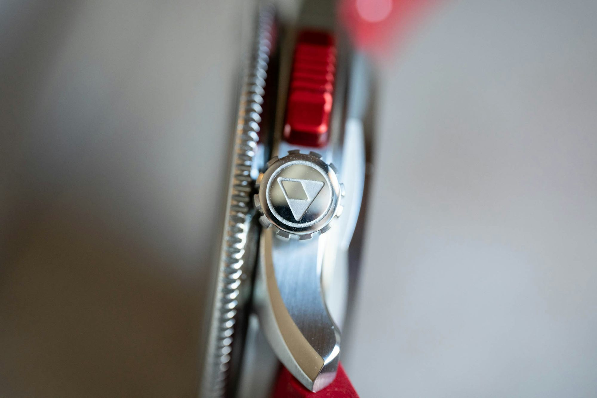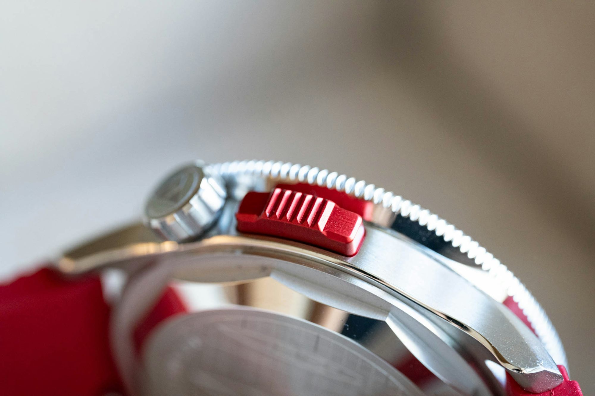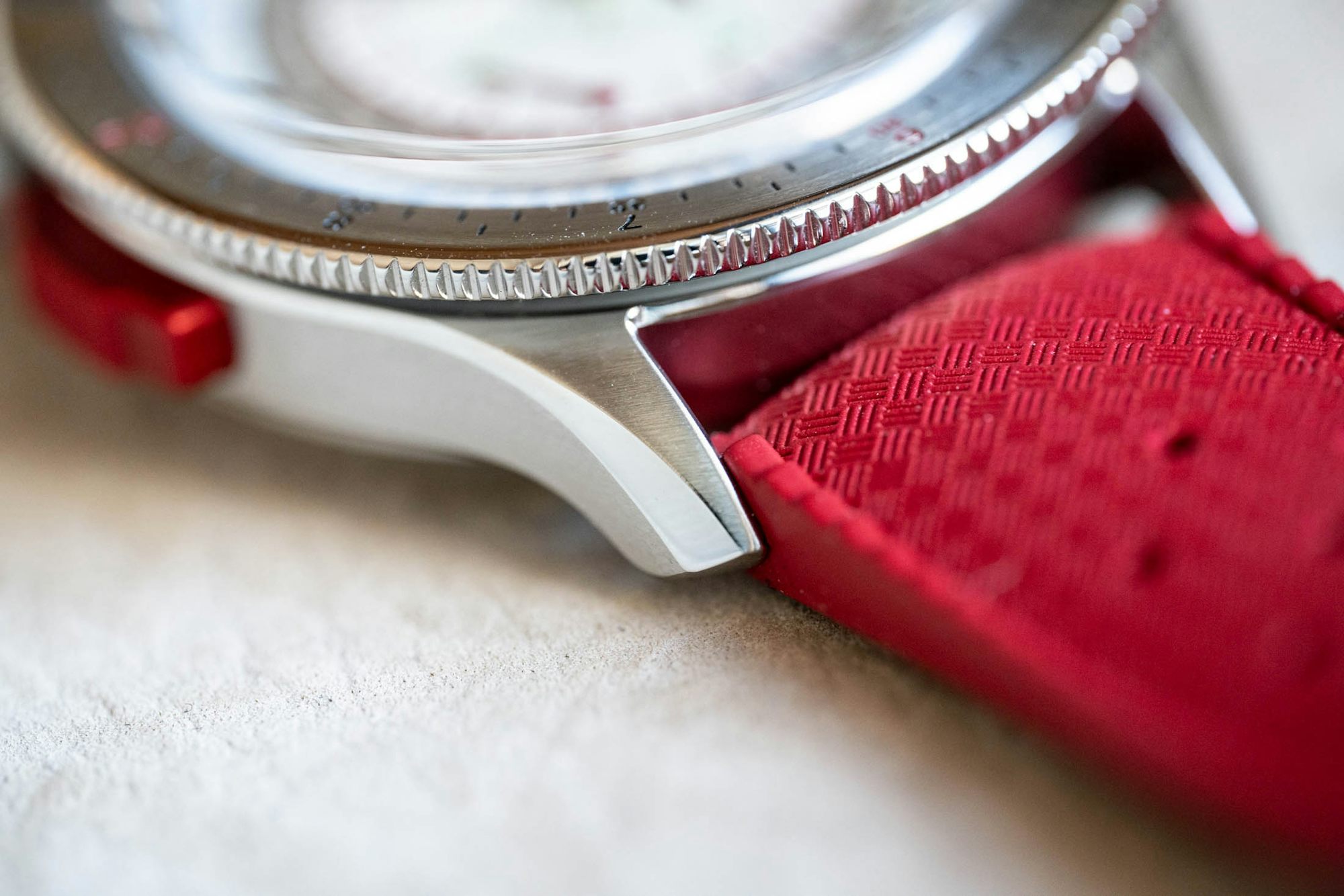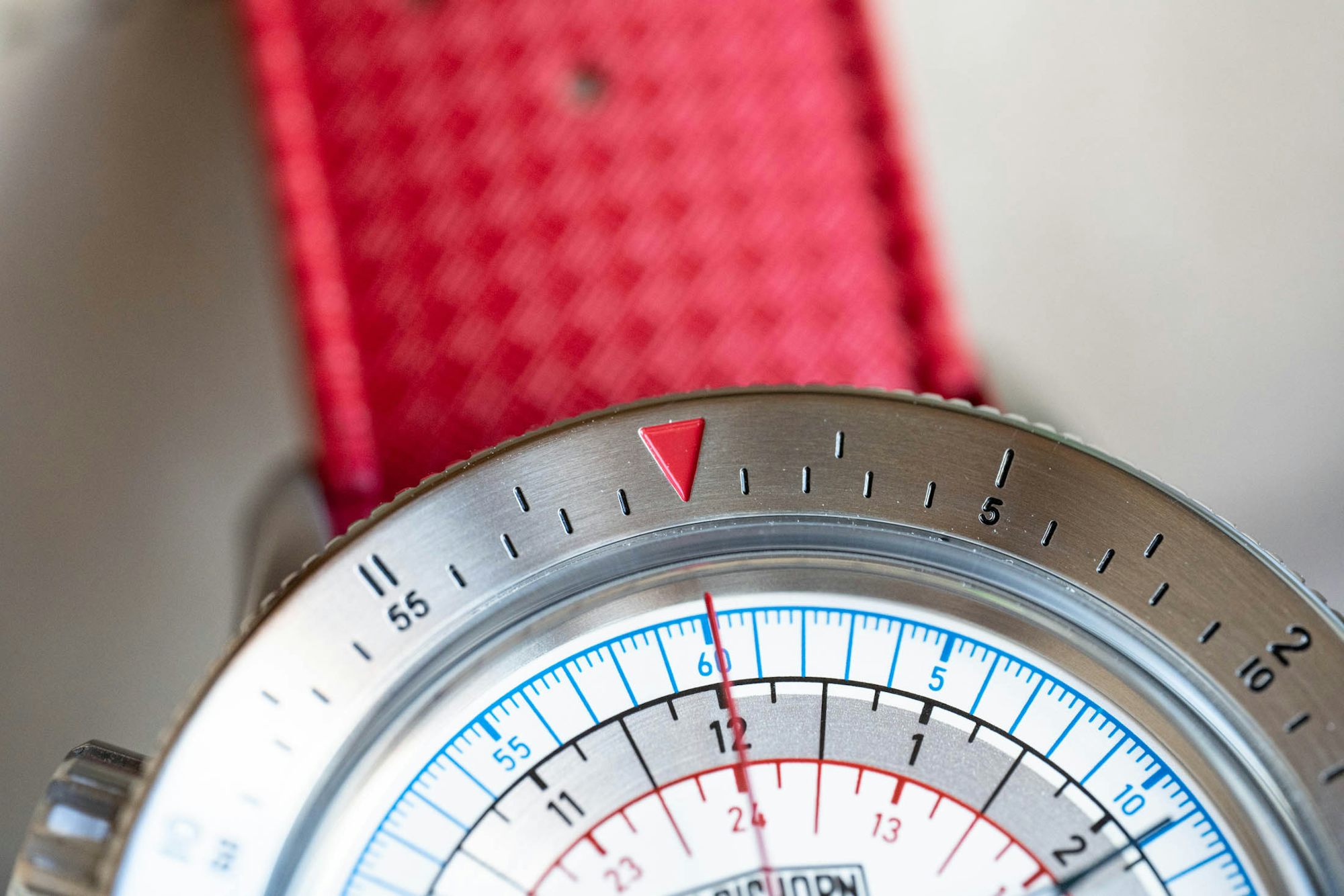 The stainless steel case is a very contemporary 39mm in diameter and 13mm in thickness, with an oversized 41mm bidirectionally rotating steel bezel. The concave bezel is easy to operate and smooth turning with a good enough resistance, with hour and minute tracks engraved and infilled with black and red. The crown, located at 10 o’clock, is prominently engraved with the Albishorn icon with a nice bead-blasted contrast. A bright red aluminum chronograph pusher (I assume the material was chosen to achieve that saturated anodization) is located at 9 o’clock with aggressive ridges and feels great to operate.