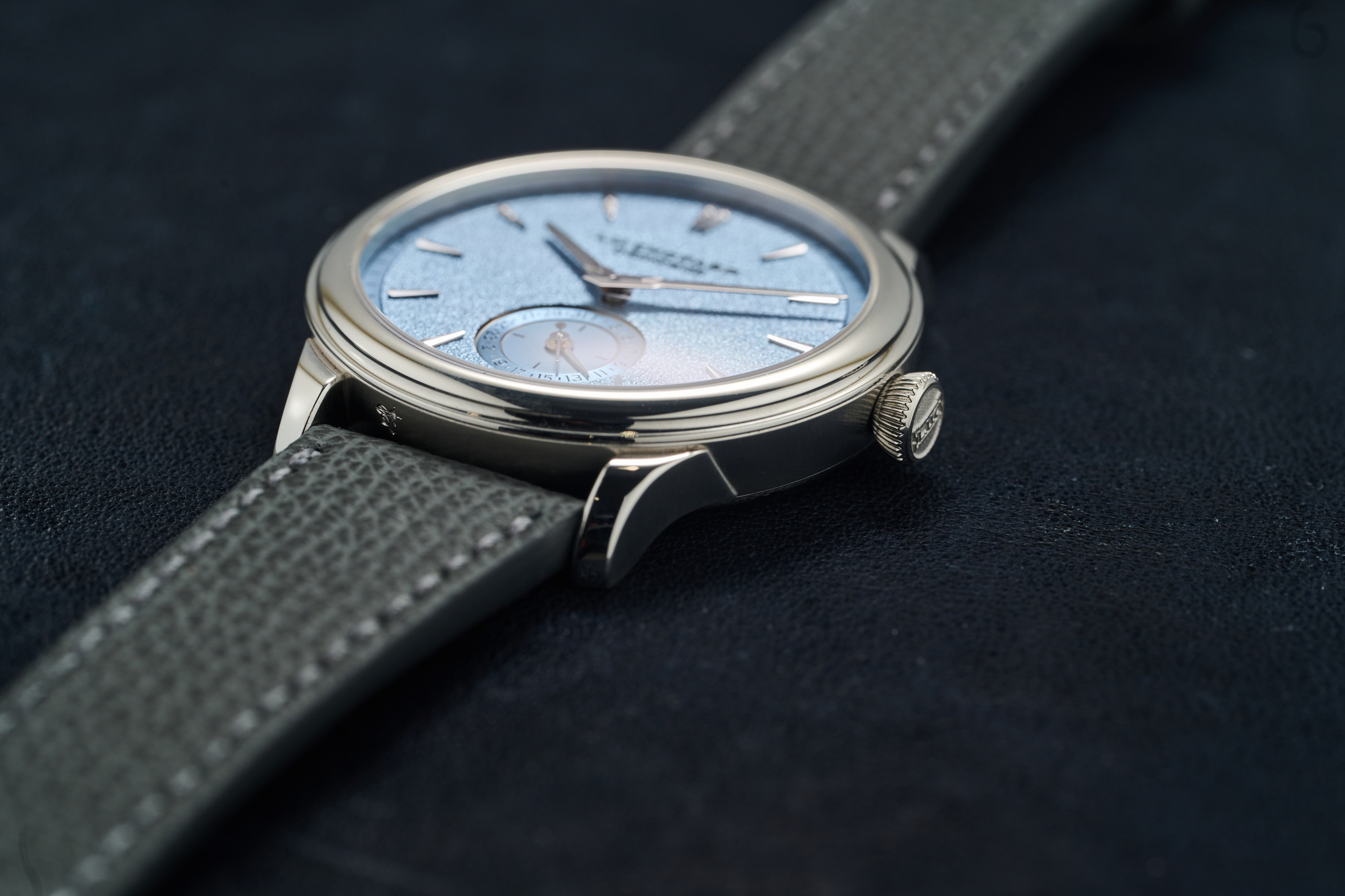 I keep returning to this word, but the hands and hour markers, too, have been simplified in a great way. The “herringbone-type” markers are rightly sized, and the “dauphine fusée” main handset has been slightly redesigned and downsized compared to last year’s XPS Forest Green and even our XPS 1860 Officer Limited Edition For Hodinkee — both going a long way towards that simplified feeling on the wrist.