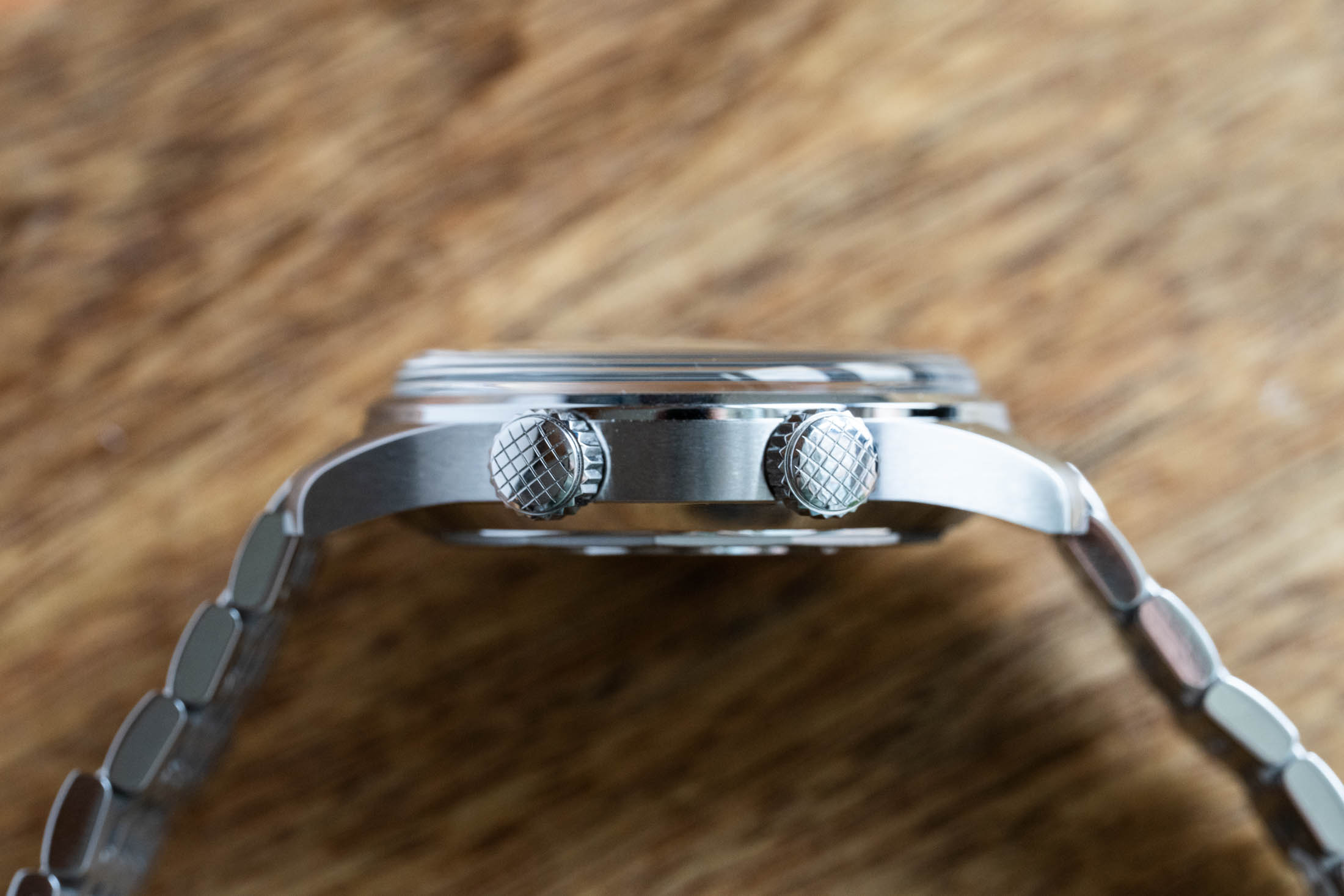 A prominent box crystal sits high, covering both the dial and the matching internal rotating bezel. Two screw-down crowns on the side of the case, both with compressor-inspired cross-hatching, operate all the functions. The crown at two o’clock manipulates the internal bezel in both directions, while the crown below it sets the time and manually winds the watch. While the internal bezel does not have a ratcheting system, I found that the crown provided enough resistance to allow me to align the bezel as I pleased.