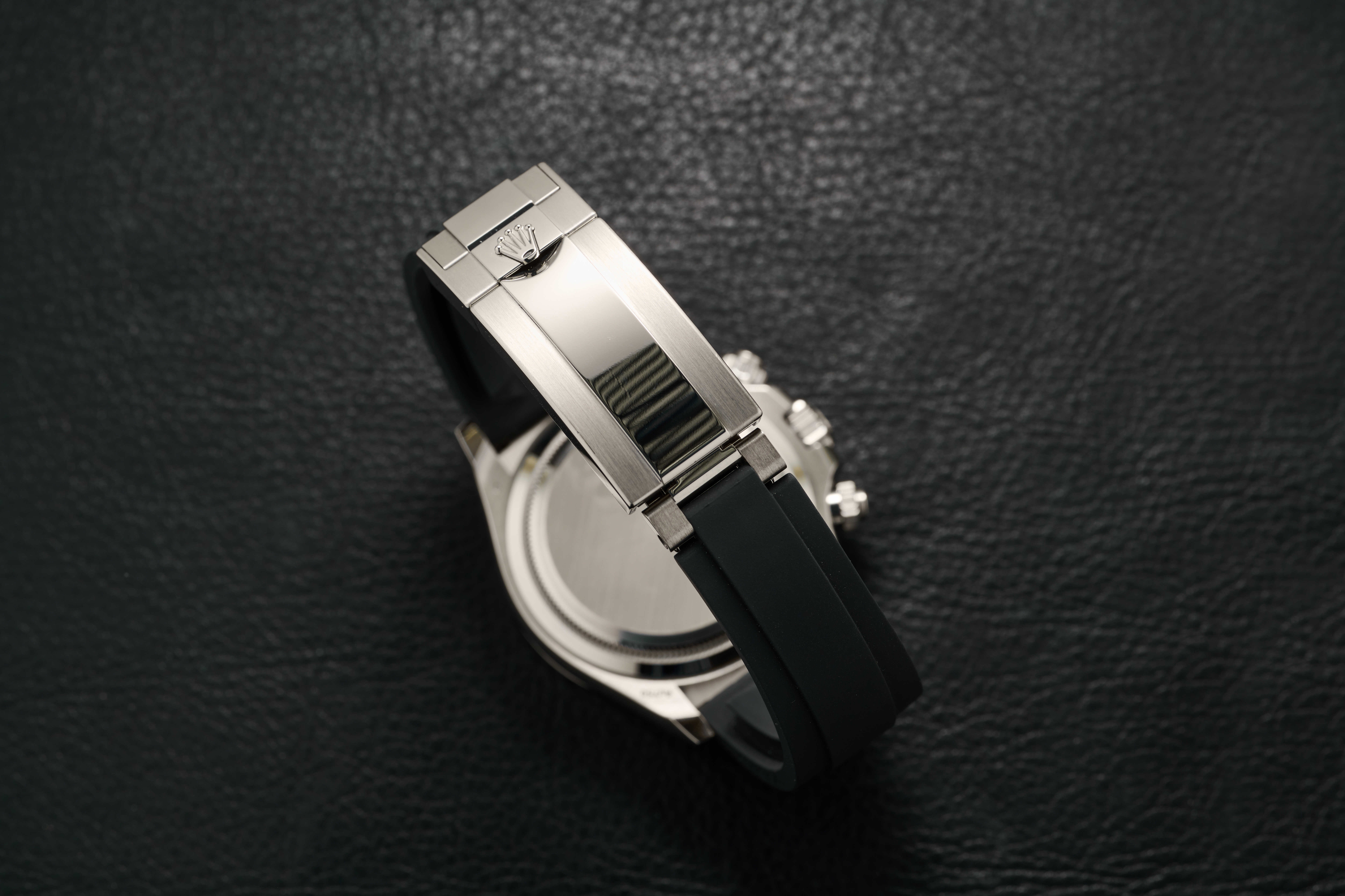 The Oysterflex bracelet, with its titanium and nickel alloy blade inner structure, is one of the most robust and comfortable rubber bracelet/strap options on the market, and Rolex (and pedantic fans) will be quick to point out that this isn’t a strap. Covered in a black elastomer, the bracelet has a raised center structure that emulates the Oyster bracelet, while elevated inner wings keep it slightly elevated off the wrist for air flow (so less sweatiness) and fixed in place so it doesn’t rotate on your wrist.