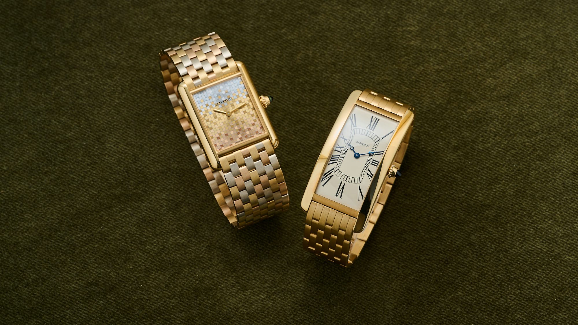 The production process demonstrates meticulous attention to detail: “We test them in brass, and then if they look right and actuate right, then we make them in gold, and then we hand-finish them. Hand-finishing is one of the most laborious parts because you have to hand-finish every piece.” Each bracelet features screwed links toward the end — a modern adaptation absent in vintage pieces. Inspired by historical Cartier examples, these solid 18k gold bracelets feature seven-link rows shaped to complement specific watch models: stout links for the Tank Louis Cartier and slim ones for the Tank Cintrée. Solid gold end-links fit flush against the watch case, while a butterfly clasp ensures secure wearing.