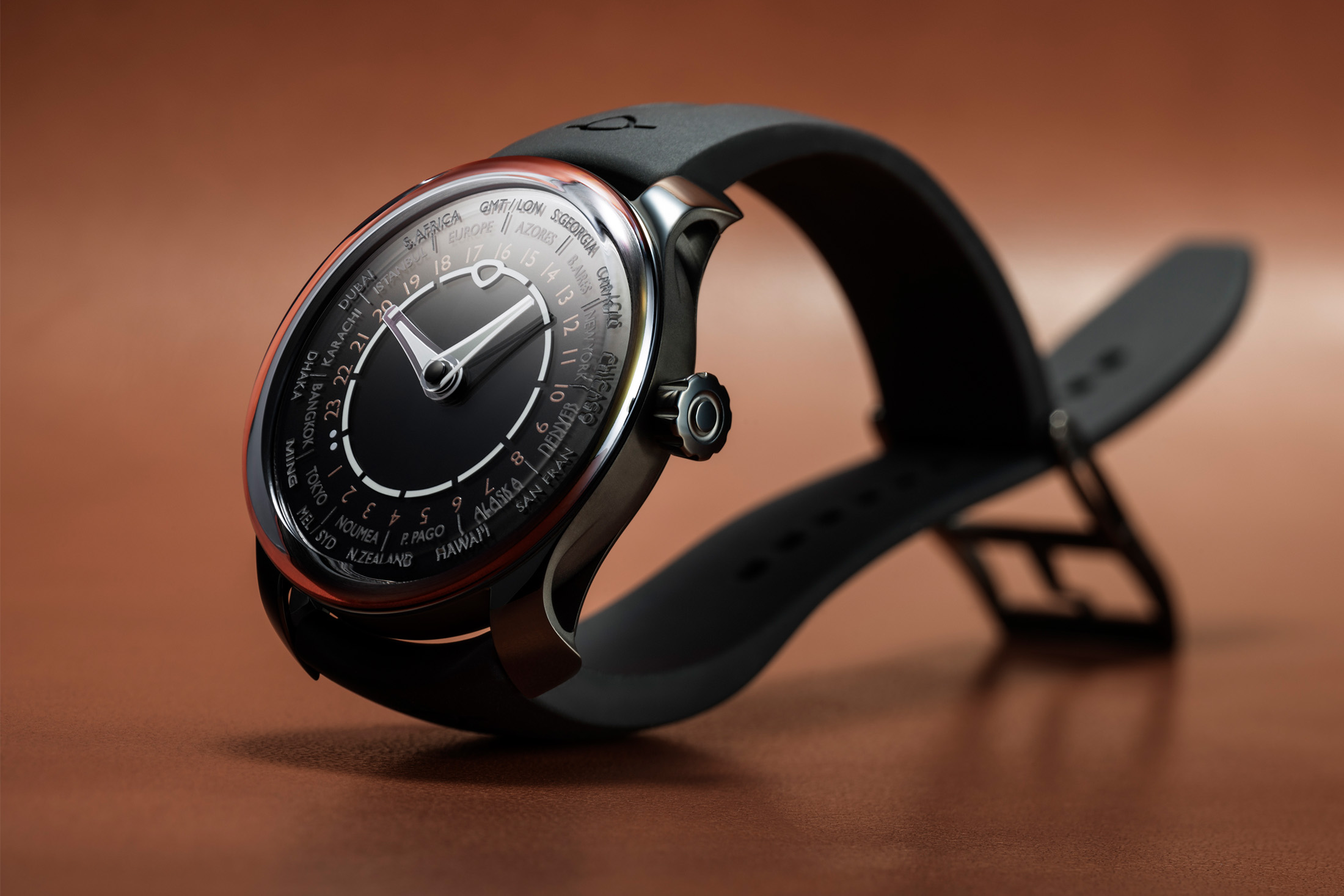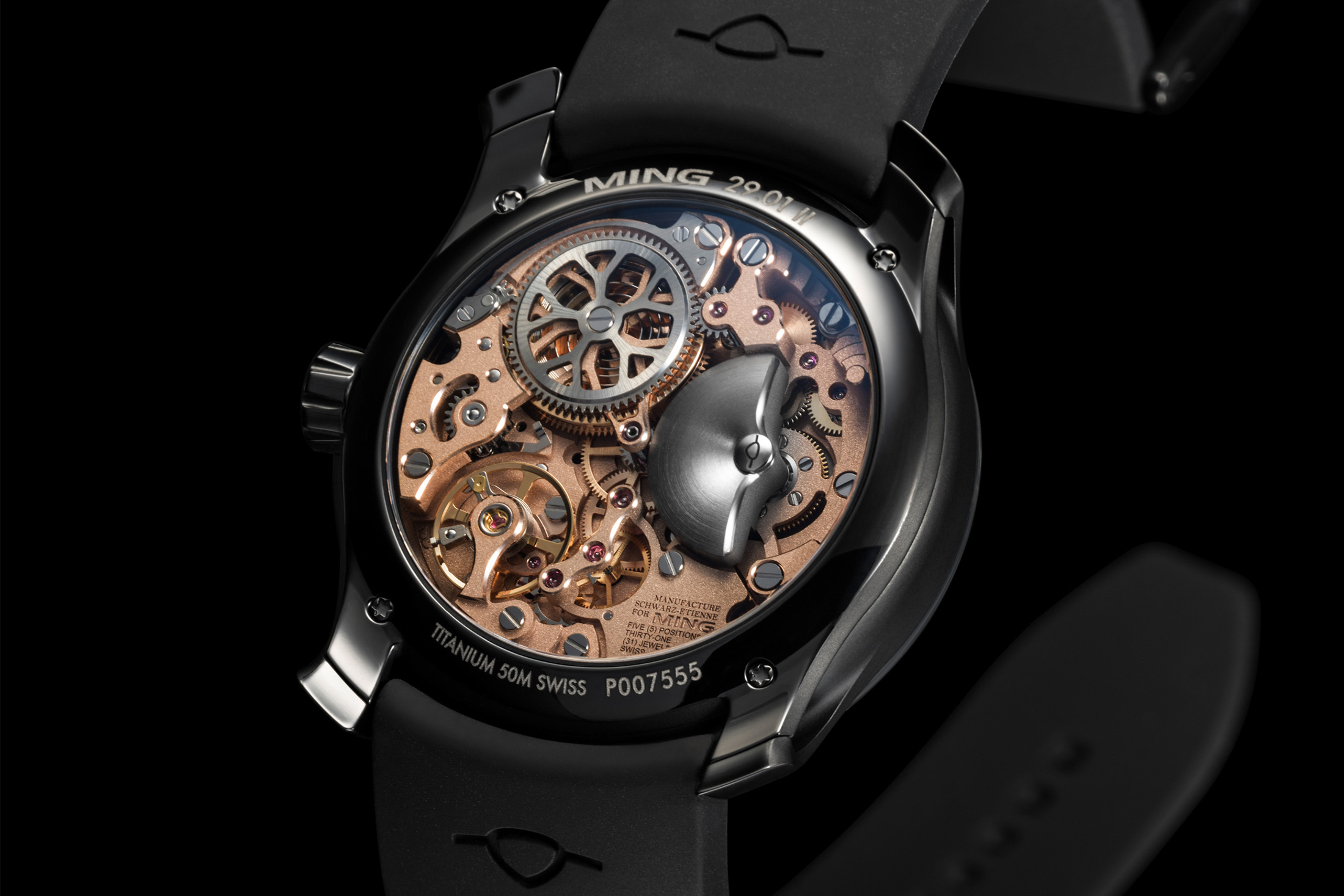 I’ll start with my disclaimer that I’m not typically a fan of coatings on watches. Yes, DLC treatment is usually durable enough. Still, I often find that there are too many fingerprints to deal with on coated watches, as you might glimpse at in some of my photos when I saw this watch during Time To Watches in Geneva last month. That said, I find that Ming’s ultra-modern designs go together well with DLC, and I’ve found myself wanting to own some of them. The ‘Midnight’ edition of the 29.01 is very much one of those moments. Yes, this is just a new colorway, but I think it improves the design. While the original 29.01 in titanium looked quite conventional until you looked closer, this new jet-black makeover with a rubber strap adds a lot to the mystery. It visually suspends elements of the dial in a dark void. In person, the effect is delivered spectacularly.
