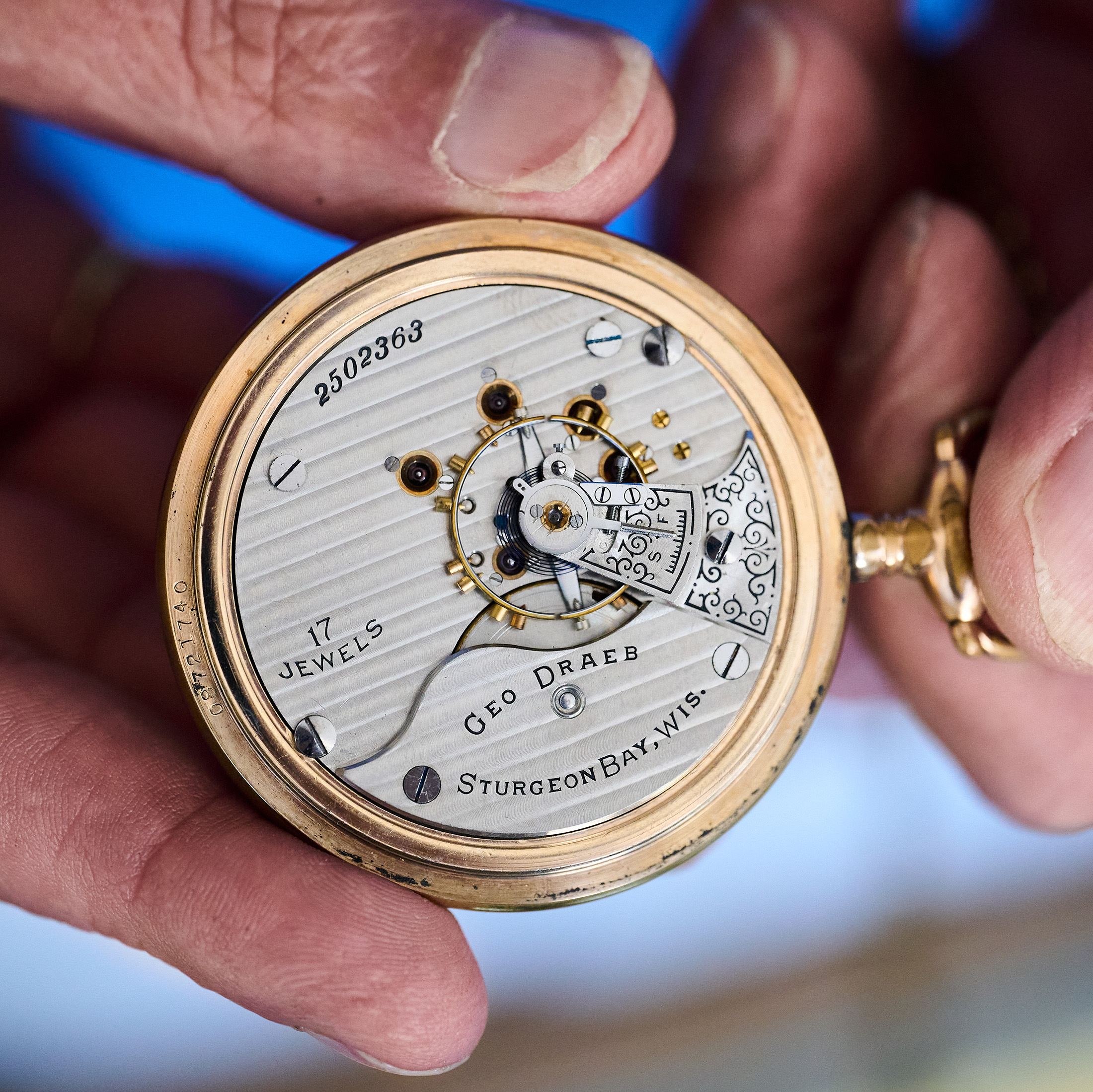 When George met me at the door, he had a perfect pocket watch for the occasion: an Illinois Grade 69 from 1913, just like mine, but for George Draeb Jewelers in Sturgeon Bay, Wis., the sister watch, so to speak, of mine. It was about 12,000 serial numbers off, so likely not ordered in the same batch, but it was a great start.