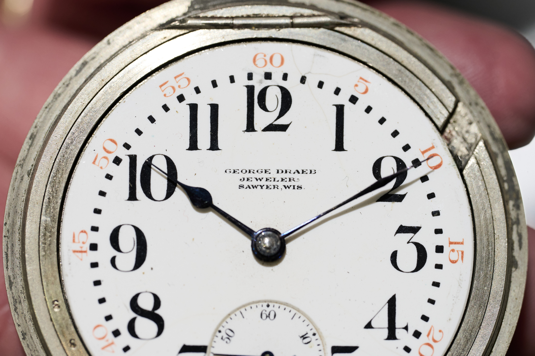 I like to collect private labels – when I can find a deal – from cities that have special meaning to me. It’s a great way to get into pocket watches while still having the fun of a “hunt.” I have about a dozen and am still looking for rare ones, like an example from my hometown. One “grail” of mine is from Fred McIntyre, who was a jeweler in what was (anachronistically and now maybe inappropriately known as) the “Indiana Territories.” But to me, it’s a fascinating representation of how much has changed in such a short time. In the meantime, I keep searching for more personal watches, so I was excited when my dad sent me a link to eBay from George Draeb Jeweler, Sawyer, WI.