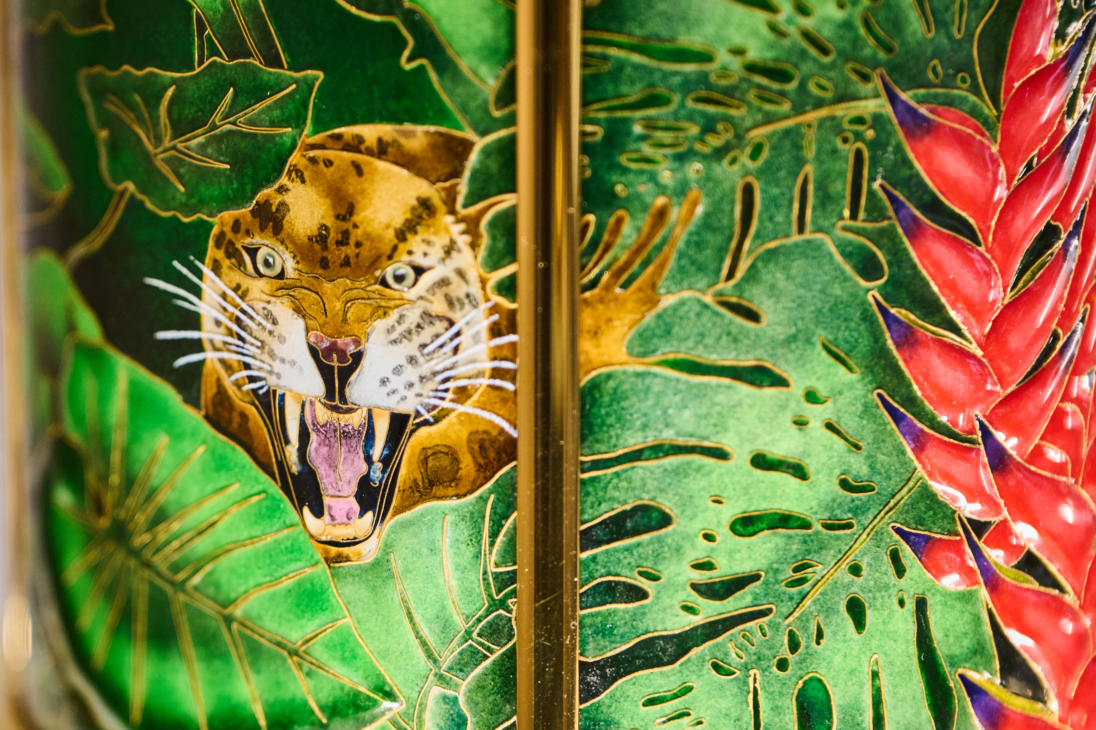 The ref. 995/125G-001 “Jaguar” pocket watch. The caseback was hand-engraved on four levels with a jaguar rendered in miniature painting on enamel. Foliage is in relief. The crown has a peridot cabochon.