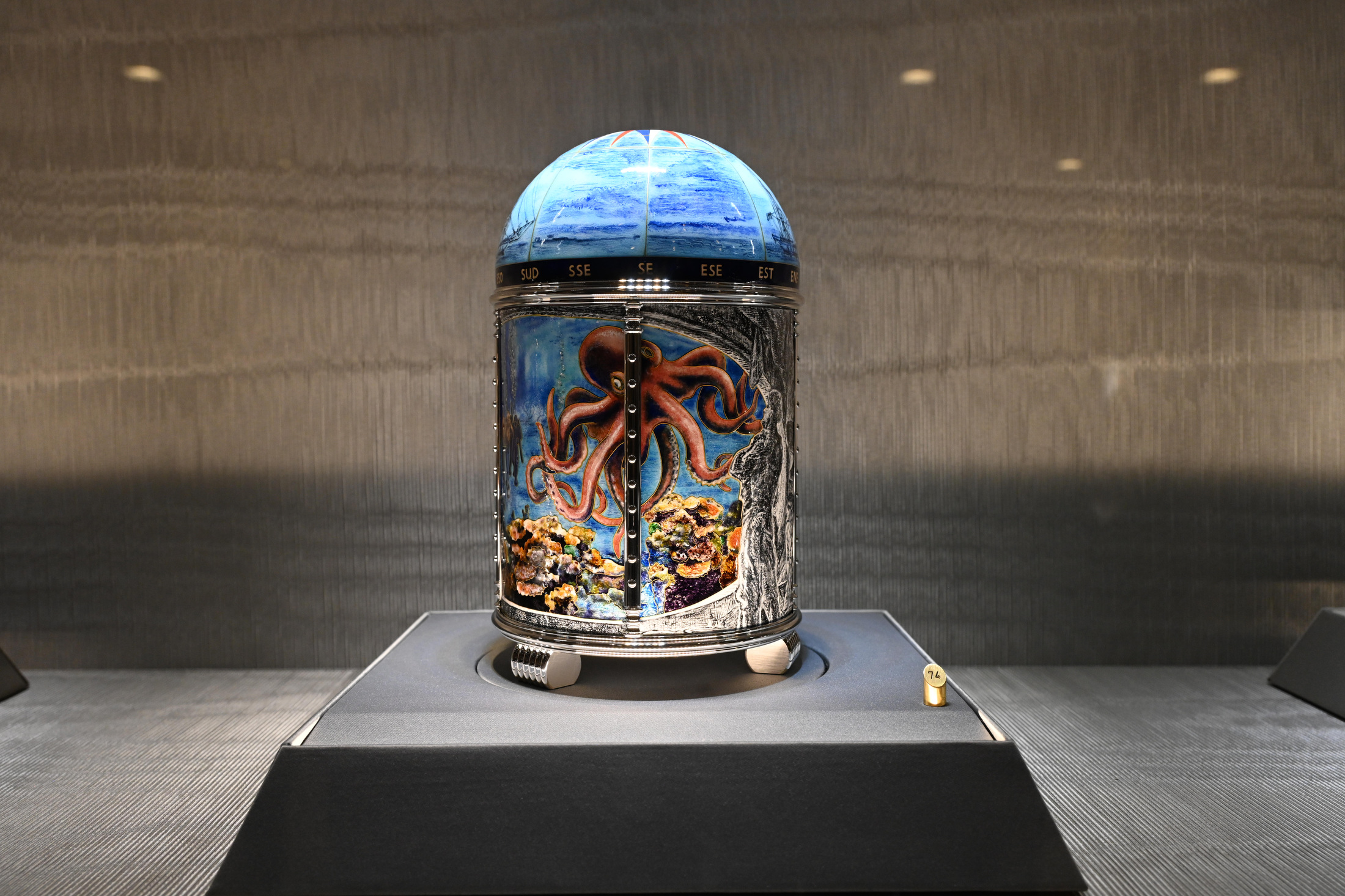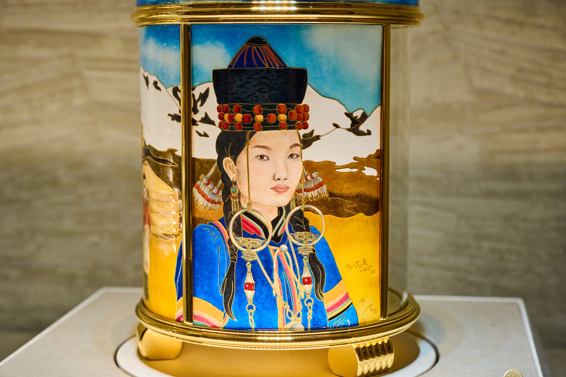 The ref. 20182M-001 “Mongolia” dome table clock in cloisonné enamel and miniature painting on enamel. This is a unique piece featuring, among other things, yaks, yurts, and eagle hunts, with an hour circle in brown lacquer, with 28 colors for the miniature painting. There is approximately 38.4 meters of gold wire for the cloisonné, and the clock is powered by the 17 ” PEND mechanical movement rewound by an electric motor.