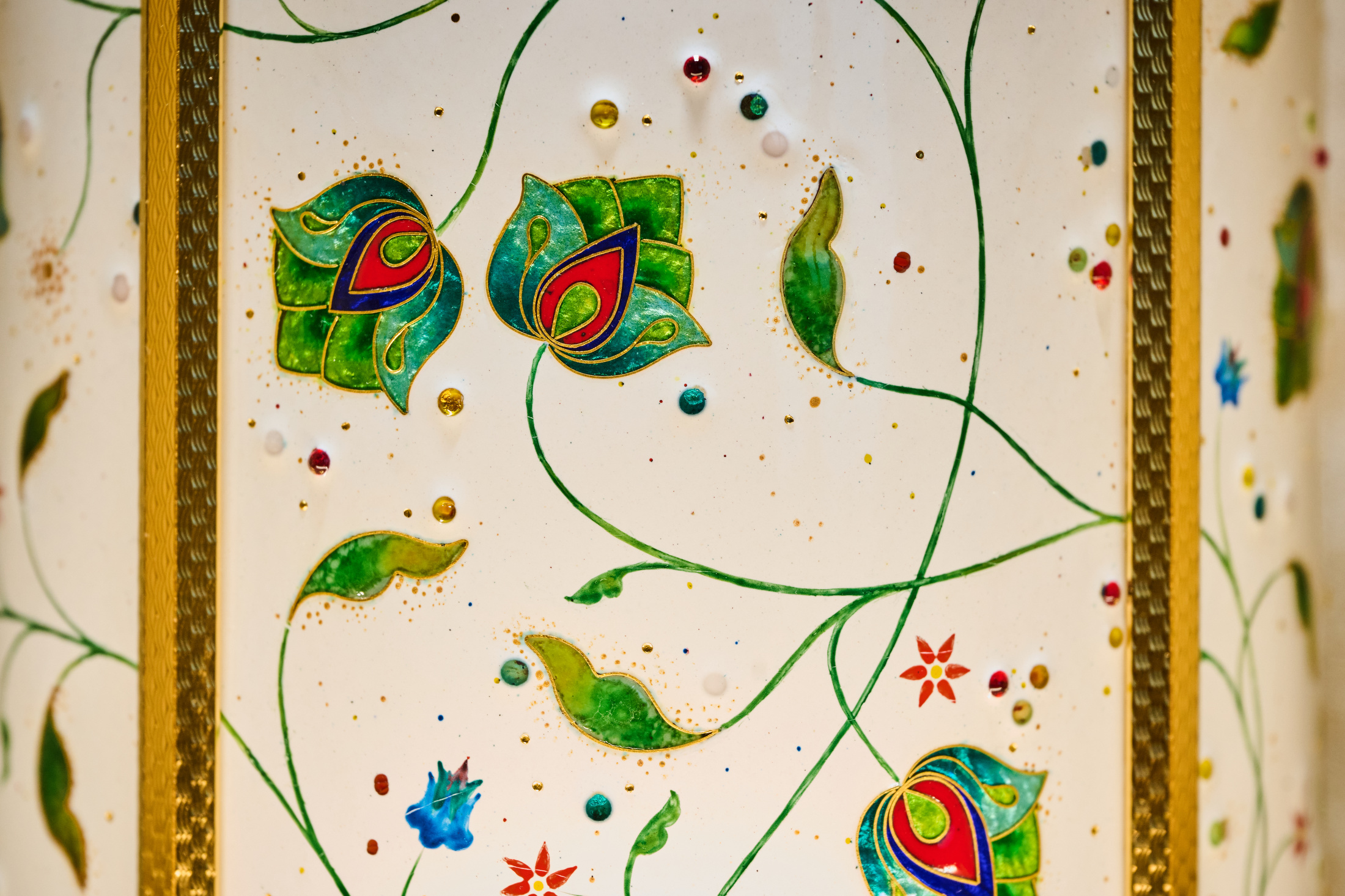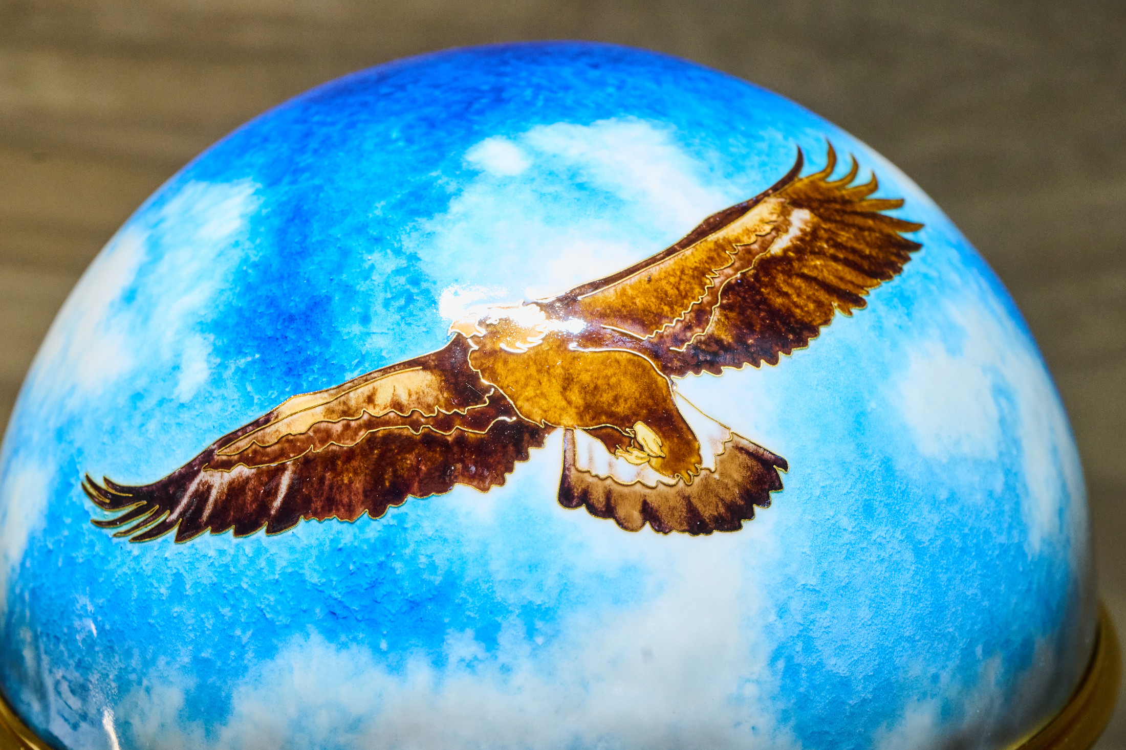 One of the most vibrant dome clocks in the display, this one features 41 colors of enamel and miniature painting in 8 colors.