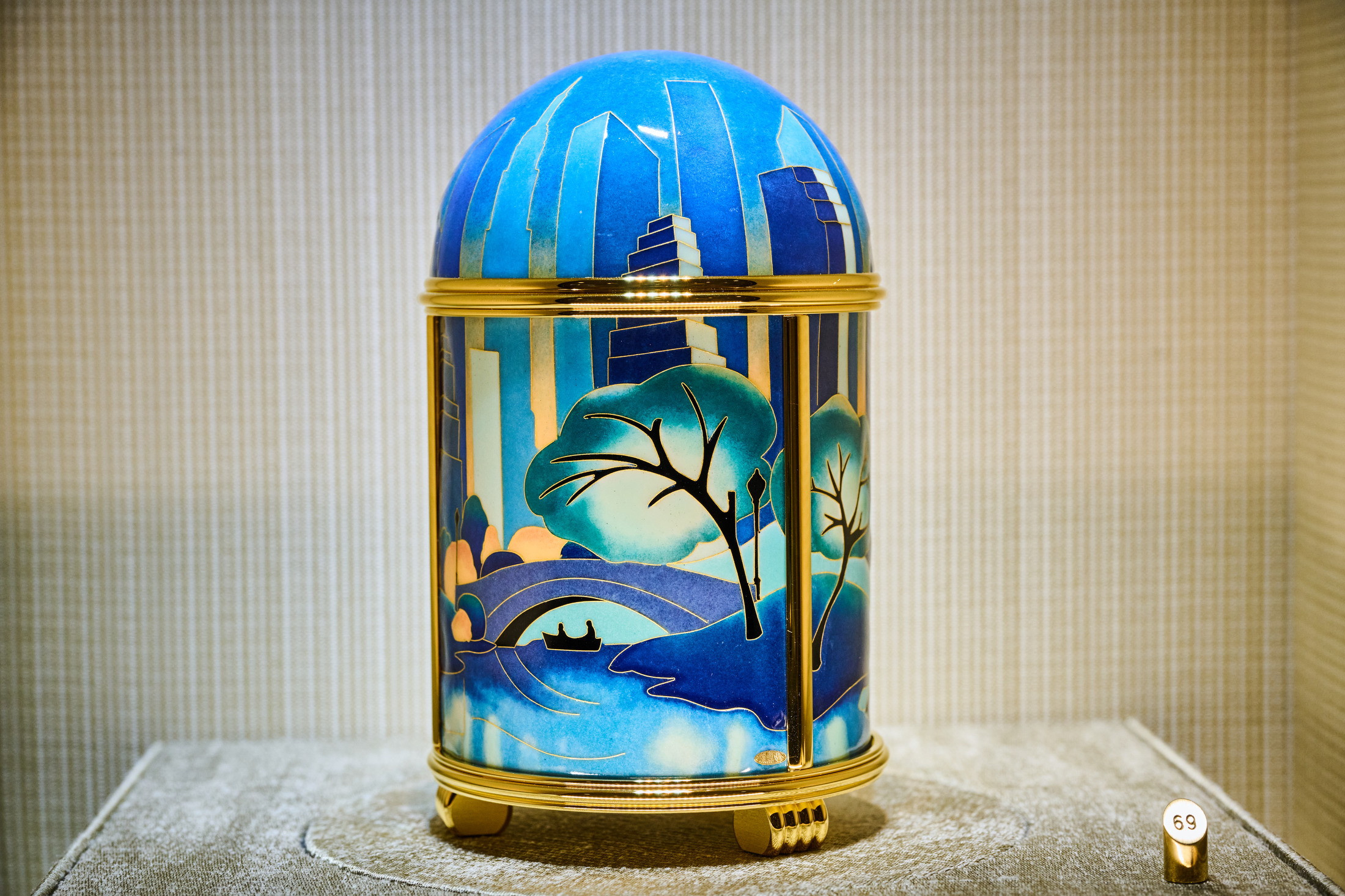 My personal favorite small dome table clock from Patek Philippe this year was the ref. 10043M-001 “Central Park” in cloisonné enamel and miniature enamel.