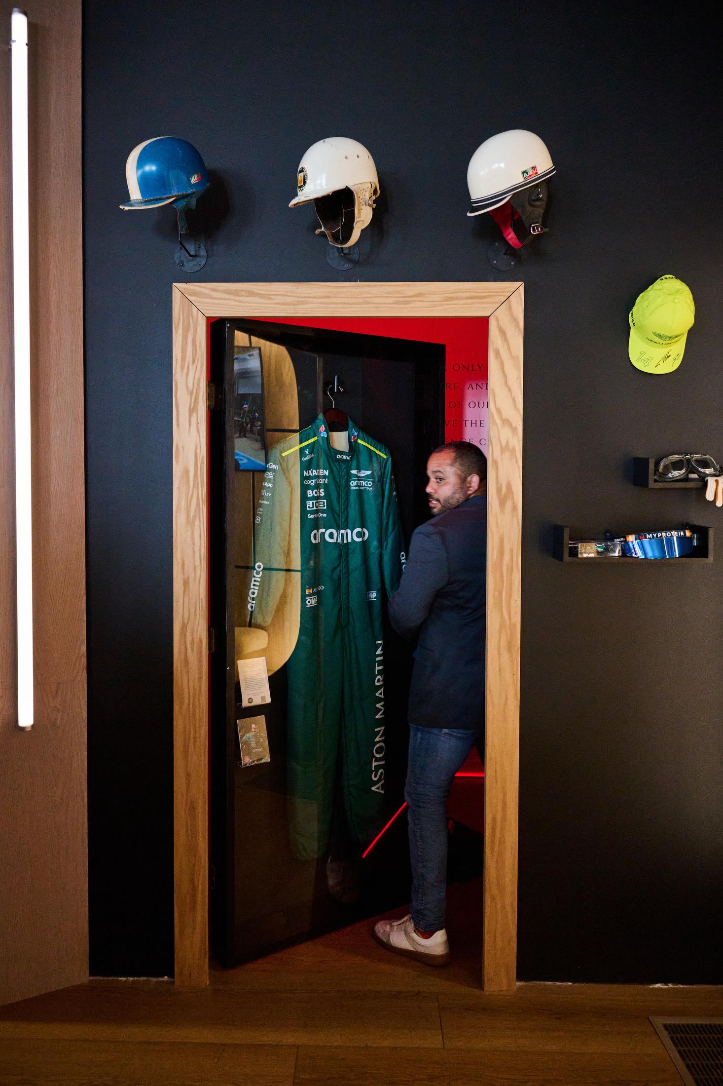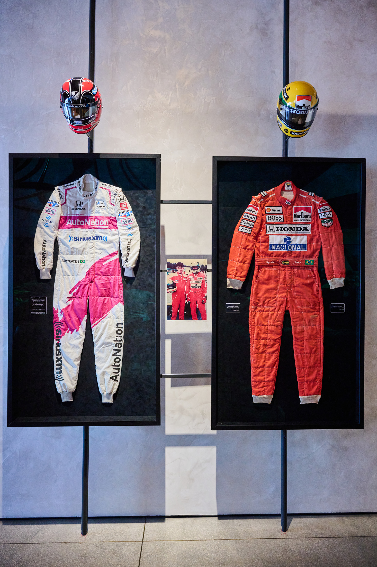 Helio Castroneves’ suit next to Ayrton Senna’s in the club lounge.